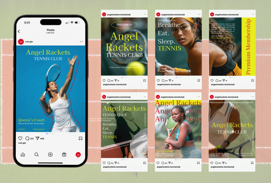 Angel Rackets is a premium tennis club for players at all levels. We wanted to give it pops of colour to establish the brand’s confidence that sets it apart while also staying true to the clean premium look.